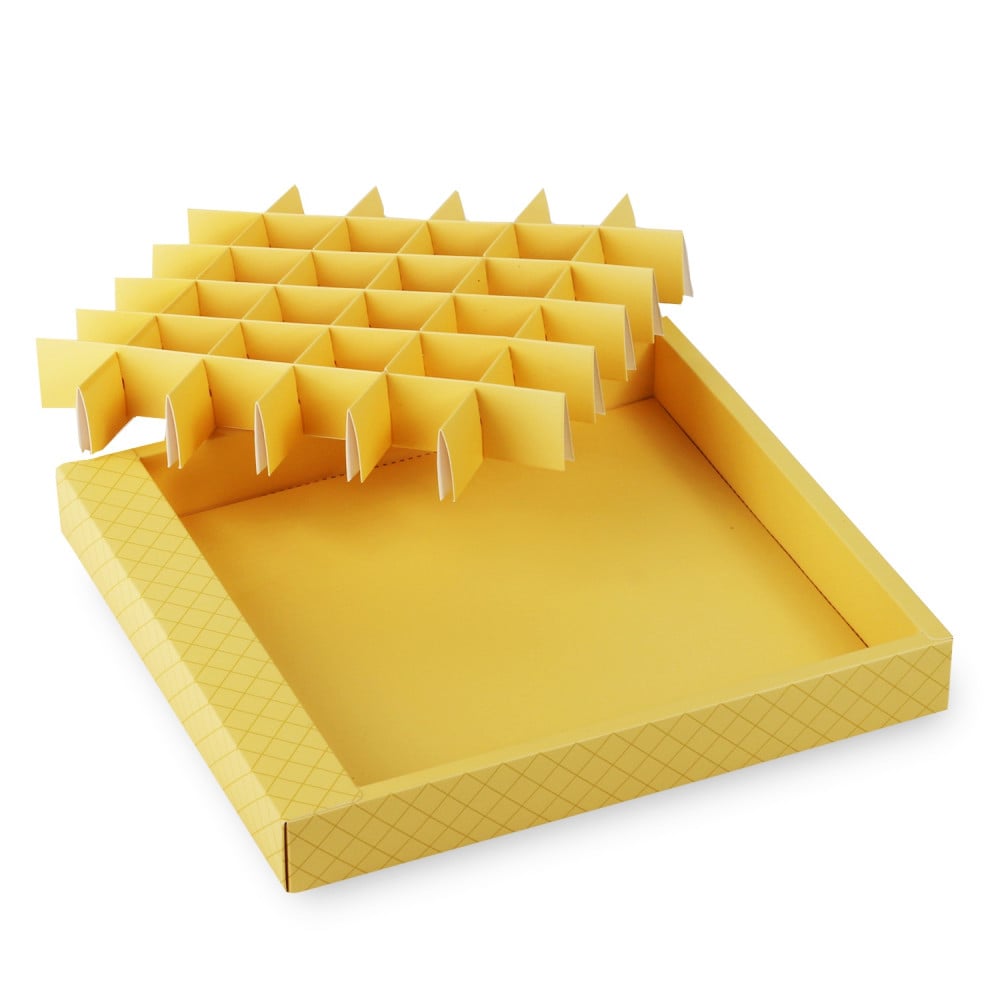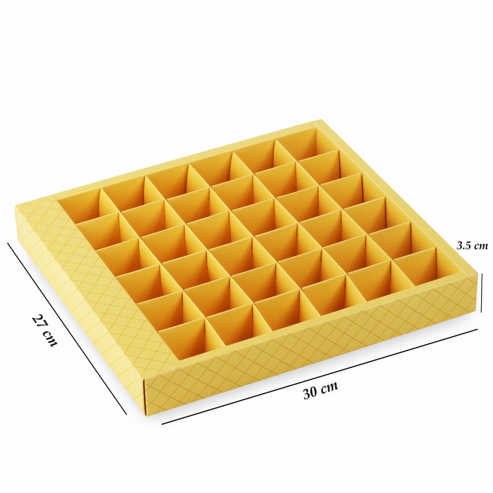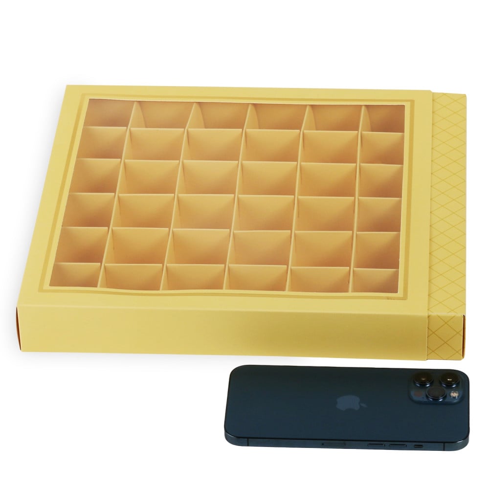 • The box of chocolate and sweets is designed in yellow with a golden pattern. It contains 36 sections on the inside to prevent the flavors from mixing and avoid damaging their appearance. It has a transparent window at the top surrounded by an elegant golden color to highlight your product in a delicious and luxurious way.