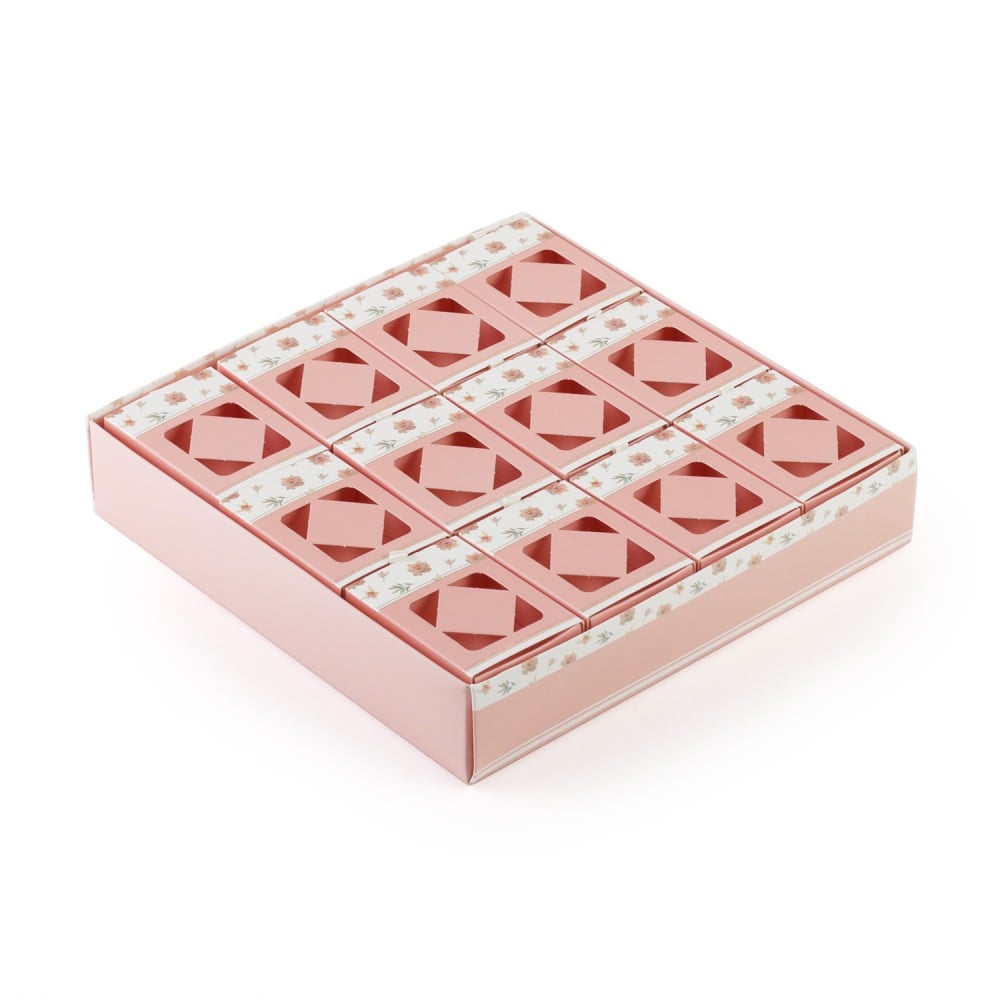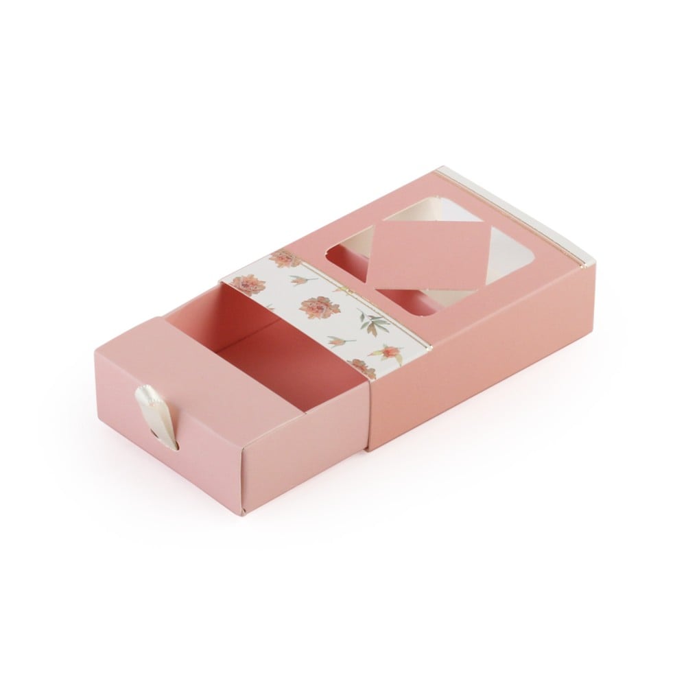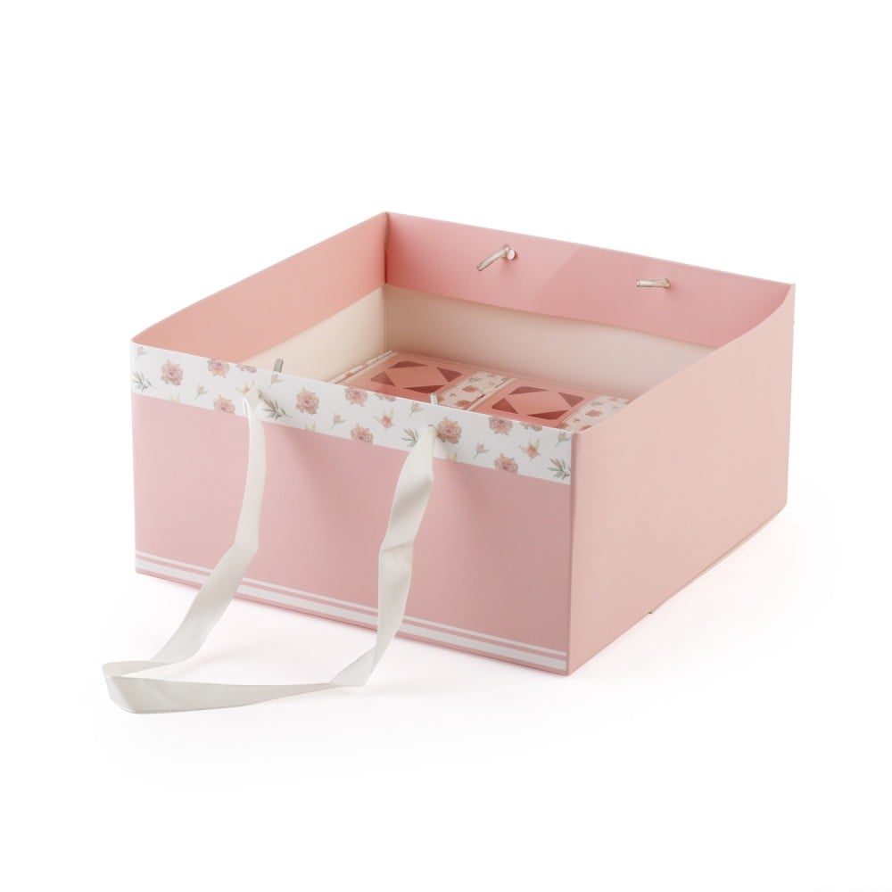 علب توزيعات بتصميم عصري ولون وردي، مُزينة برسومات الورود