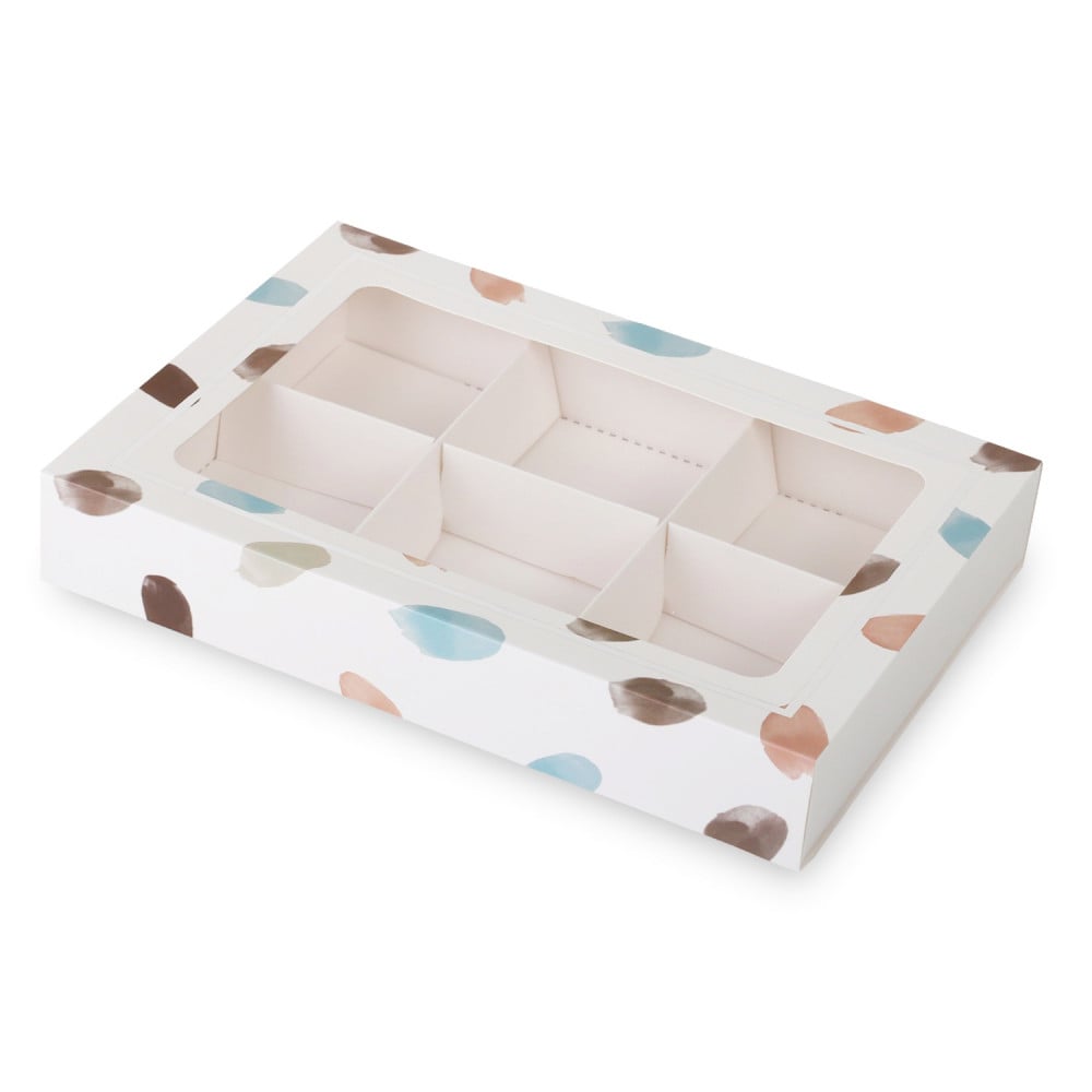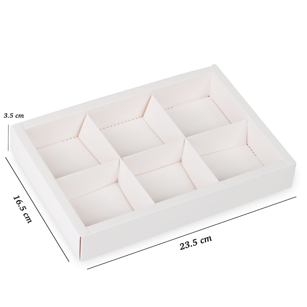 علبة الشوكليت والحلويات مصممة بلون أبيض ونمط تيرازو تحتوي على 6 أقسام من الداخل لتمنع إختلاط النكهات وتجنب إتلاف مظهرها، لديها نافذة شفافة من الأعلى محاطة باللون الفضي الأنيق لتبرز منتجك بشكل شهي وفاخر