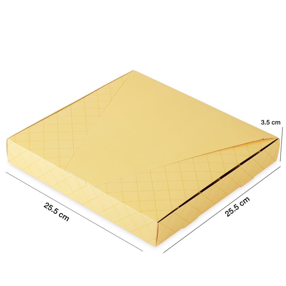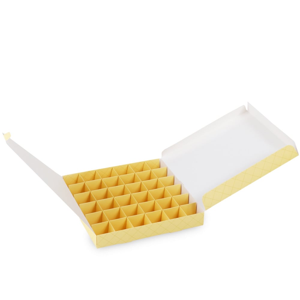 علبة الشوكليت والحلويات مصممة بلون أصفر ونمط ذهبي تحتوي على 36 قسم من الداخل لتمنع إختلاط النكهات وتجنب إتلاف مظهرها، تغلق من الأعلى بغطاء محكم أنيق وجذاب يساعد على إبراز منتجك مثالية للشوكولاتة ، الحلويات التقسيمات قابلة للإزالة سهلة التركيبالطول : 25.5 سمالعرض : 25.5 سمالإرتفاع : 3.5 سماللون : أصفر بنمط ذهبيالكمية : (6) علب
