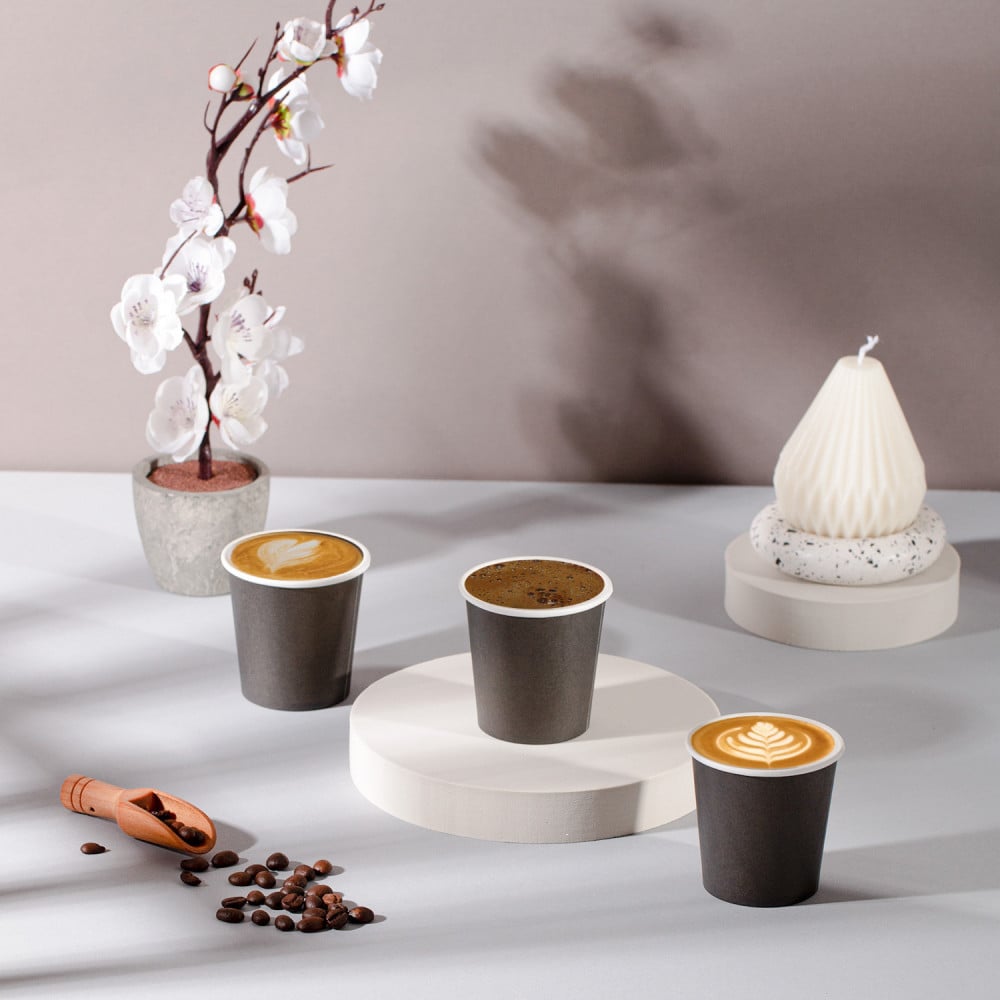 - استمتع بمشروبك الساخن في أكواب ورقية فاخرة باللون الأسود من صفقات والمكونة من طبقة واحدة