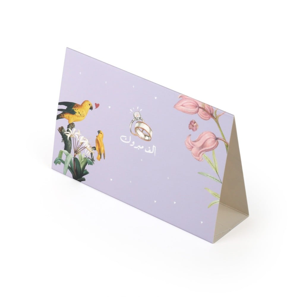 - تكتمل الأفراح وتزيد بمشاركة الأخبار السعيدة والإحتفال مع الأهل والأصدقاء، لذلك أضفنا في صفقات كرت طاولة بثيم زواج لحفلات الزفاف بلون موف، مصمم بورق مقوى مع عبارة 'ألف مبروك' ورسمة خاتم