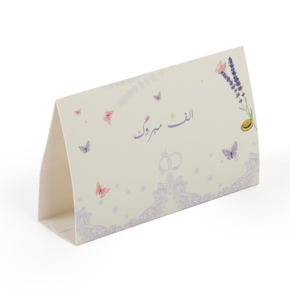 - تكتمل الأفراح وتزيد بمشاركة الأخبار السعيدة والإحتفال مع الأهل والأصدقاء، لذلك أضفنا في صفقات كرت طاولة بثيم زواج لحفلات الزفاف بلون بيج، مصمم بورق مقوى مع عبارة 'ألف مبروك' ورسمة خاتم