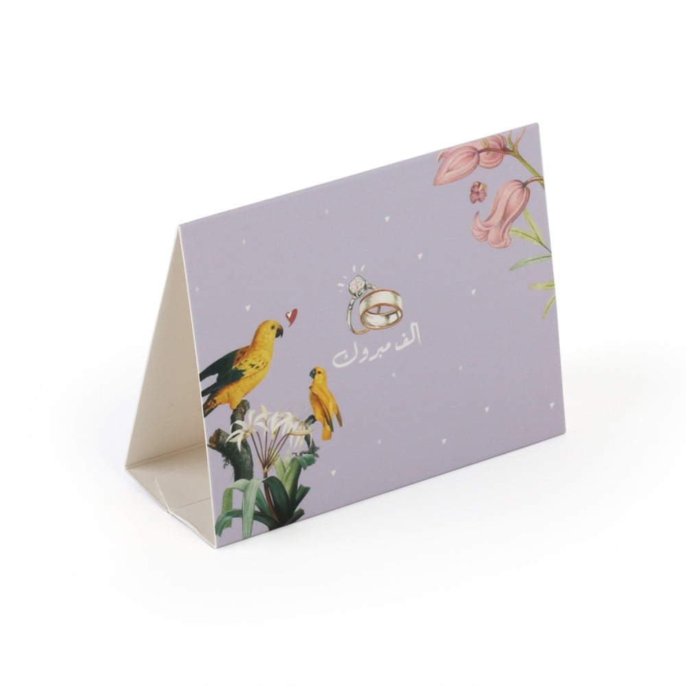 - تكتمل الأفراح وتزيد بمشاركة الأخبار السعيدة والإحتفال مع الأهل والأصدقاء، لذلك أضفنا في صفقات كرت طاولة بثيم زواج لحفلات الزفاف بلون موف، مصمم بورق مقوى مع عبارة 'ألف مبروك' ورسمة خاتم