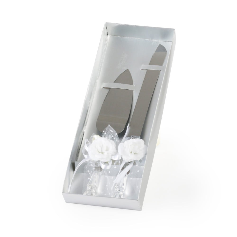 In deals, we offer you an elegant knife and trowel for cutting the wedding cake, decorated with a crystal handle and white roses to add a unique touch to the newlyweds’ serving table.
