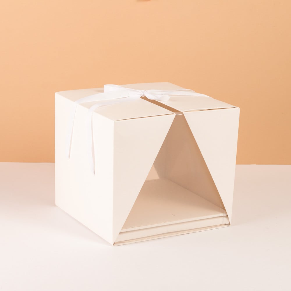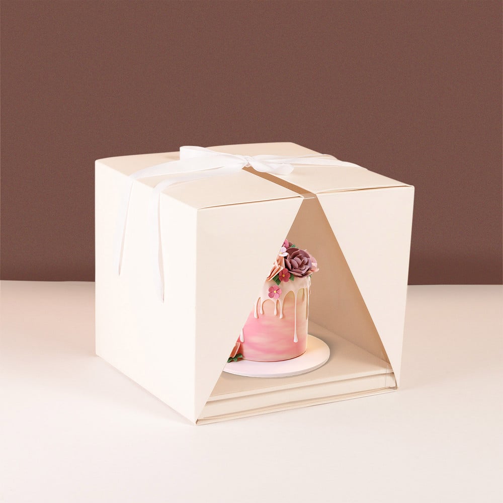 Impress your loved ones in an innovative and unconventional way by presenting cakes and gifts in a luxurious cake box from Deals, which consists of transparent windows and white sides that can be opened and closed with white satin ribbons to carry the box easily.