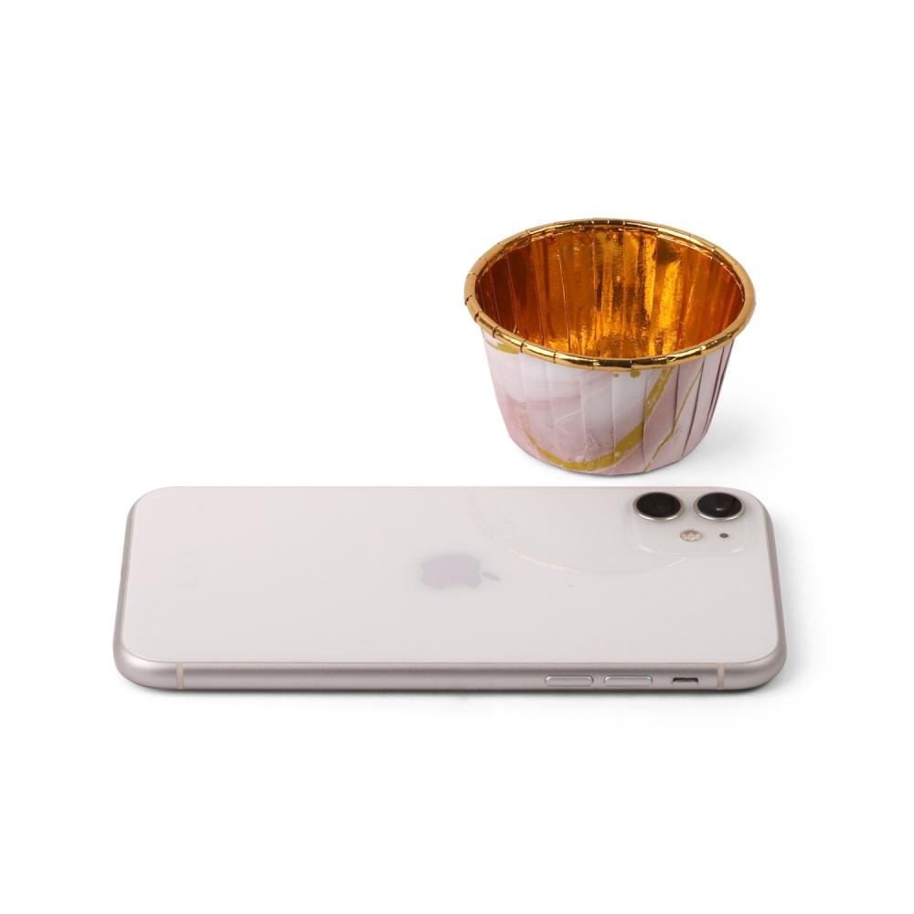 Add an elegant touch to cakes and desserts by presenting them in these luxurious pink and white corrugated paper baking molds with a hollow gold aluminum coating from Deals.